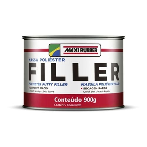 Massa Poliester Filler 900gMaxi Rubber Indicado para corrigir imperfeições em superfícies metálicas ferrosas Galvanizadas, Zincadas e Alumínio e fibra de vidro. Dicas O produto deve ser aplicado direto sobre chapa nua. Na preparação da massa catálise utilizar a quantidade correta de catalisador 1% , evitando assim problemas como, por exemplo, sangramento. Não recoloque na lata a mistura já preparada. Aguardar o tempo de secagem recomendado, para evitar mapeamento. Evitar a secagem forçada em temperaturas elevadas, pois pode causar trincas, bolhas e perda de adesão. Não é recomendado o lixamento úmido do adesivo, pois a umidade retida no adesivo durante o lixamento com água pode causar problemas na superfície e no acabamento. Isolar o local do reparo com Primer PU Maxi Rubber antes da aplicação do acabamento. Rendimento 0,59 m/kg Composição Massa Poliéster: Resina de poliéster, pigmentos, cargas e aditivos. Catalisador: Peróxido de benzoila e plastificantes. Ean: 7898031544302