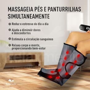 Controle Remoto: Permite ajustar a massagem de acordo com suas preferências. Modos de Massagem: Escolha entre diferentes tipos de massagem com intensidade ajustável. Ajuste Personalizável: Sistema de ajuste para se adaptar ao tamanho dos pés e pernas. Fonte de Alimentação: Funciona com corrente elétrica (bivolt) ou com pilhas, oferecendo maior praticidade. Desligamento Automático: Timer para desligamento automático após um tempo programado (5, 10 ou 15 minutos). Fácil Armazenamento: Acompanha bolsa para guardar e transportar o aparelho. Facilidade de Limpeza: Material interno que facilita a higienização do produto. Cuidados e Recomendações: Este produto não é recomendado para crianças, pessoas em estado de inconsciência, portadores de marca-passos, com distúrbios circulatórios, sensibilidade na pele ou problemas de saúde graves. Não deve ser utilizado em áreas com pele inchada, inflamada ou machucada, nem em regiões sensíveis como os olhos e o rosto.