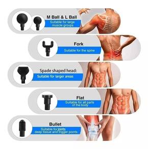 - Massagem em 20 níveis de intensidade - Aparelho de percussão e vibração - Tempo de carga: 2 a 3 horas - Tempo de trabalho: 3 a 6 horas - Bateria 2500mAh - 20 Velocidades - 6 Ponteiras