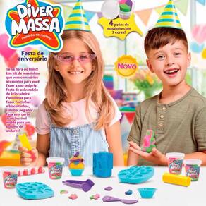 Massinha de Modelar - Diver Massa - Festa de Aniversário - Divertoys: as massinhas de modelar Diver Massa estão na moda e agora com tema de aniversário. Eba! Tá na hora do bolo? Esse kit de massinhas vem com vários acessórios para fazer a sua própria festa de aniversário. Forminhas para fazer frutinhas e biscoitinhos, rolinho, pegador, faca sem corte, 04 potes de massinha com 03 cores, seringa com 04 bicos de formas variadas e um incrível molde para um bolinho de 03 andares! Informações: • Produto: Diver Massa Festa de Aniversário • Marca: Divertoys • Coleção: Diver Massa • Tipo: Kit de Massinha de Modelar com Moldes • Categoria: Artes e Atividades • Subcategoria: Massinhas de Modelar • Tamanho: 5.7 cm (pote de massinha) • Conteúdo: - 01 Forminha de bolo de 03 andares - 01 Forminha de frutas - 01 Forminha de doces e biscoitos - 01 Seringa com 04 bicos diferentes - 01 Faca sem corte - 01 Forminha de doce - 01 Pegador - 01 Rolinho - 04 Potes de Massinha de modelar • Recomendação: para crianças a partir de 03 anos de idade Especificações: • Modelo: Diver Massa Festa de Aniversário • Referência: 8279 • Código de Barras: 7898639382795 • Embalagem (C x A x L): 41.8 x 28.5 x 06 cm • Embalagem (Peso): 0.584 kg • Material / Composição: - Massinha: Fórmula Diver Massa - Acessórios: Termoplástico • Registro: 003808/2022 • Certificado: Órgãos Autorizados - OCP´S (Organismos de Certificação de Produtos) Aviso: • As imagens são meramente ilustrativas • Os pesos, tamanhos e medidas são aproximados • As cores e estampas dos produtos podem ter variações • As informações são de responsabilidade do fabricante ou fornecedor
