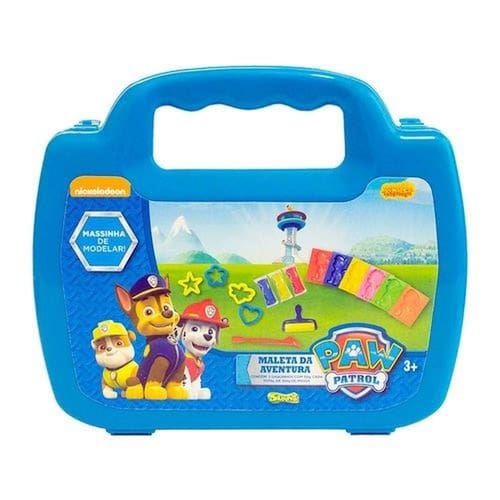 Maleta de massinhas da patrulha canina, sunny, nickelodeon, a maleta contem 3 saquinhos com 50 gramas cada somando no total 150 gramas, a maleta tambem contem 12 acessorios para brincar que auxiliam no manuseio das massinhas de modelar.