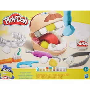 Play Doh Massinha Brincando De Dentista - Hasbro F1259 O novo conjunto Play Doh Brincando de Dentista da Hasbro acompanha um paciente com uma boca cheia de cáries, pronto para ser atendido pelos pequenos dentistas AVISO: 1 Dos acessórios se chama Broca ela vem com sistema de fricção só ficar apertando o botão que a broca gira, não utiliza pilhas. AVISO: Produtos e cores podem variar daquelas representadas na embalagem as imagens são meramente ilustrativas Contém: 1 Cabeça de Dentista, 9 Acessórios temáticos e 4 Potes de Massinha Play Doh, 2 Potes de Massinha Burst e 2 Potes Massinha Metálica (Totalizando 8 Massinhas Play Doh). Idade recomendada: 3+ anos Fabricante: Hasbro Franquia: Play-Doh Material: Plástico/Massinha de Modelar Play Doh REF: F12595BOO EAN: 5010993831623 Material composto pela massa de modelar PLAY DOH : Água, farinha de trigo, cloreto de sódio, cloreto de cálcio, amido de milho, óleo mineral, estearato de PEG-50, sulfato de alumínio, benzoato de sódio, fragrância e colorante. OBS - A Massa de modelar não e comestível