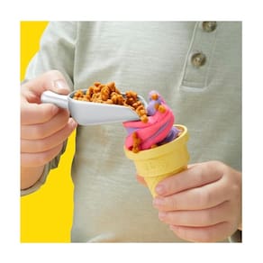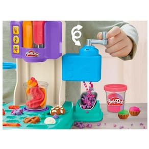 Kit Sorveteria Colorida permite criar sorvetes de todos os tipos de formas! Basta inserir 2 ou mais cores Play-Doh no brinquedo e pressionar a manivela para ver a taça girando e a massa descendo como se fosse um sorvete. As crianças podem criar granulados e outras decorações de Play-Doh como pretzel, frutas e doces. Este kit vem com 5 potes de massa de modelar Play-Doh, sendo 3 potes exclusivos com cores duplas e 7 acessórios como cone de sorvete, prato, taça com tampa, entre outros.