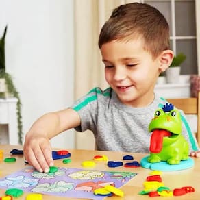 Brinquedos pré-escolares como este conjunto de brinquedos de sapo permitem que as crianças brinquem e explorem cores com atividades criativas e divertidas para crianças de 3 a 5 anos. Faça insetos Play-Doh, cresça a língua longa e boba do sapo e muito mais. combinar E ordenar cores com os cortadores e moldes e, em seguida, organize-os por cor para combinar com os lírios no tapete de jogo.