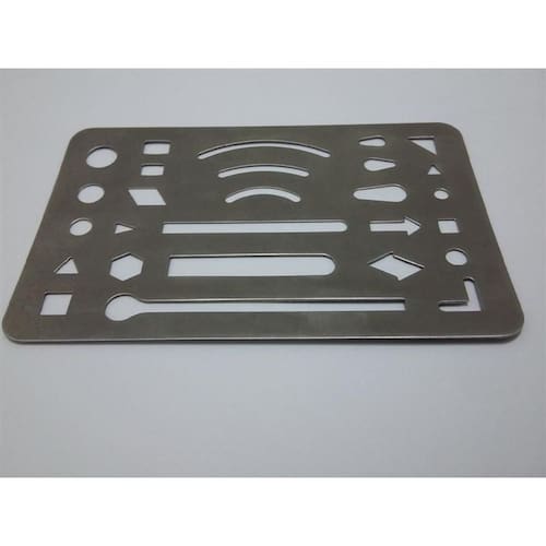 Chapa de rasura em alumínio. Conhecido como "Mata-gato". Indicado na utilização de pequenas correções em desenhos.
