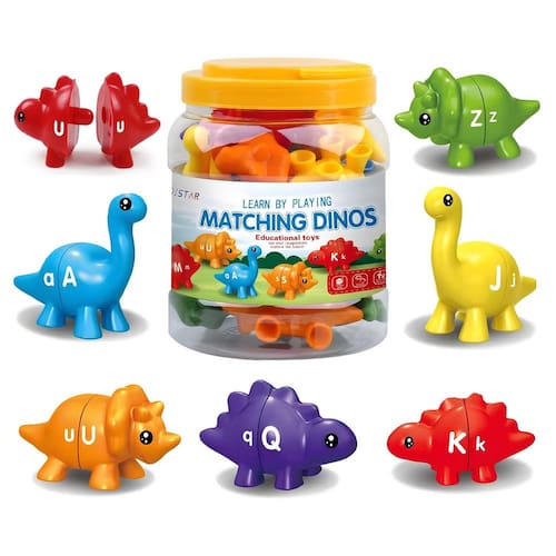 - [Alphabet Dinosaur Matching Toys] Nossos brinquedos de aprendizagem pré-escolar para crianças pequenas vêm com 26 peças e 13 dinossauros coloridos. Os dinossauros são Tyrannosaurus Rex, Triceratops e Braquiossauro. Cada dinossauro tem dois pares de letras maiúsculas e minúsculas. Os lindos dinossauros do alfabeto são fáceis de combinar e combinar e vêm embalados em um lindo frasco de plástico resistente. Os animais fofos e realistas são companheiros divertidos para bebês.