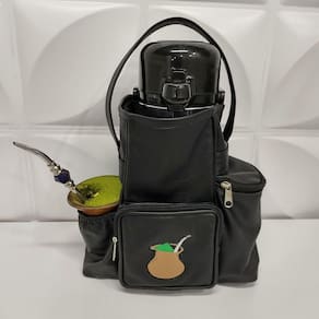 A nossa Bolsa Mateira confeccionada em Couro possui compartimento para térmica com redução de tamanho nas costas (desse modo pode acomodar tanto a térmica grande quanto o modelo menor), possui um bolso para o pacote de erva mate, um bolso para a cuia e um bolso de zíper para levar objetos que desejar. Possui uma alça de mão para facilitar o transporte.