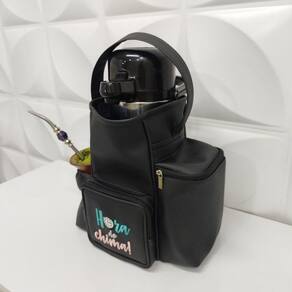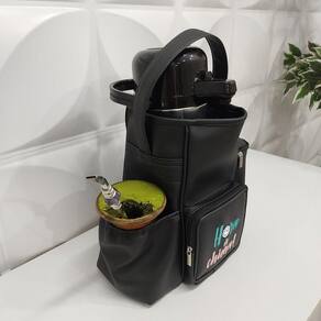 A nossa Bolsa Mateira possui compartimento para térmica com redução de tamanho nas costas (desse modo pode acomodar tanto a térmica grande quanto o modelo menor), possui um bolso para o pacote de erva mate, um bolso para a cuia e um bolso de zíper para levar objetos que desejar. Possui uma alça de mão para facilitar o transporte. Trabalhamos com material sintético de alta qualidade e durabilidade. Não hidrolisa (não descasca). Metais Niquelados.