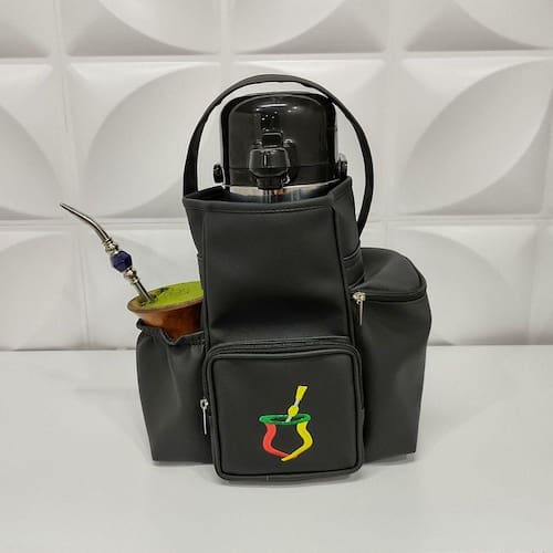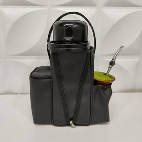 Possui 30 cm de altura x 29 cm de comprimento x 14 cm de largura. Possui 3 bolsos (um para o pacote de erva, um para a cuia e outro com zíper para levar objetos) e 1 compartimento principal para a térmica. Alça de mão. Possui forração interna. Metais Niquelados.