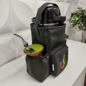 A nossa Bolsa Mateira possui compartimento para térmica com redução de tamanho nas costas (desse modo pode acomodar tanto a térmica grande quanto o modelo menor), possui um bolso para o pacote de erva mate, um bolso para a cuia e um bolso de zíper para levar objetos que desejar. Possui uma alça de mão para facilitar o transporte.