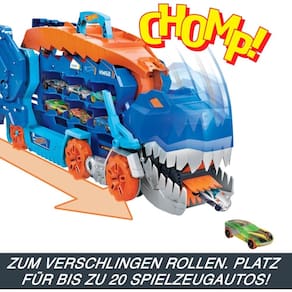 Transforme o Hot Wheels City Ultimate Hauler de um transportador de mais de 20 carros de brinquedo em um T-Rex rosnando e pisoteando! Role o caminhão e observe-o devorar veículos em escala 1:64 em seu caminho. Use-o para armazenar mais de 20 carros em escala 1:64! Puxe a cauda para trás e o caminhão se transforma em um T-Rex que tem ação de pisada animada acompanhada de luzes e sons. A parte de trás do T-Rex é uma pista de corrida de duas pistas. Corra com os carros Hot Wheels incluídos; o vencedor continua, enquanto o segundo colocado fica 'cagado' no dinossauro. As crianças podem lançar seus carros pela boca do T-Rex e parece que ele está cuspindo. Luzes e sons aumentam a diversão com olhos vermelhos brilhantes e arrotos, mordidas e peidos! O Hot Wheels City Ultimate Hauler inclui 2 carros Hot Wheels em escala 1:64, sendo um ótimo presente para crianças a partir de 4 anos.