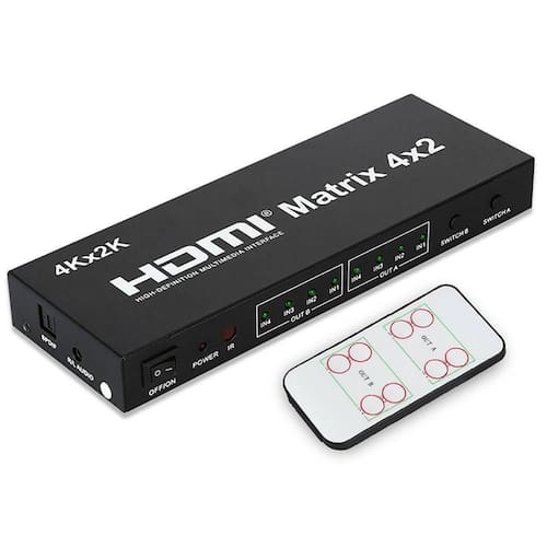 O Matrix HDMI 4x2 possuí quatro entradas HDMI que podem ter suas imagens ser exibidas em suas duas saídas. Controlado por meio de botão no aparelho ou via controle remoto, ele suporta resoluções 720p, 1080i, 1080p e 2160p. Além de realizar o chaveamento ele amplifica o sinal diminuindo a perca em longas distâncias. Conecte até 4 aparelhos e escolha em qual das 2 saídas cada imagem será exibida. Até 25 metros com 720p e cabo de boa qualidade. Características Tipo: Switch Matrix HDMI Modelo: 4x2 Matrix HDMI Conectores: Fêmea Tipo: HDMI 1.4 B Suporta: 2K e 3D Suporte DVI 1.0 + HDCP1.3: sim Formato de áudio suportados: DTS-Hd/dolby-True HD/LPCM7.1/dts/dolby-ac3/dsd Compatível com HDCP: sim Detecção HDMI: sim E-EDID dados: sim Compatível com cabos HDMI-DVI: sim Suporte plug and play: sim Resoluções suportadas: 480p, 576p, 720p, 1080i e 1080p. Também: 4Kx2K. 4K com cabos até 8 metros. 1080p com cabos de até 15 metros. Conteúdo da embalagem: 01 Matrix HDMI 4x2, 01 Controle, 01 Fonte Bivolt e 01 Folheto explicativo. Ean: 353012320308