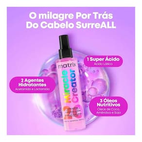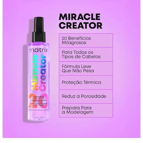 O Matrix Miracle Creator Spray 190?ml reúne 20 efeitos em um único produto: desembaraça, nutre, hidrata, protege do calor, reduz frizz, fortalece, melhora o brilho, a maleabilidade, suaviza pontas, repara danos, prolonga a cor, doa força, dá toque sedoso, ajuda na secagem, protege os fios UV, redefine os cachos, hidrata a fibra, reduz volume, dá equilíbrio térmico e facilita o styling. Leve e versátil, é ideal para todos os tipos de cabelo, promovendo resultados visíveis e instantâneos, com performance profissional em casa.