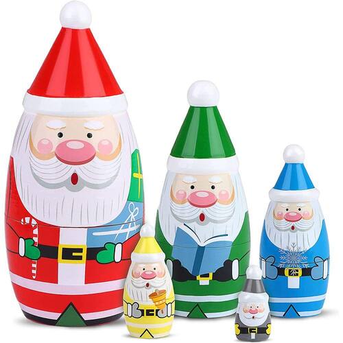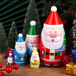 5 Diferentes cores e padrões de bonecas de Papai Noel. Ambos agradáveis para crianças como brinquedos e para adultos como coleção ou decoração. Esta boneca matryoshka é bastante leve para que as crianças possam brincar e operar facilmente.