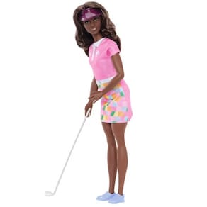 Vamos acertar em cheio! A Barbie Golfista está pronta para balançar seu taco de golfe com estilo, vestindo um outfit perfeitamente desenhado. Com um vestido de golfe removível, estampado em rosa na saia, tênis roxos e uma viseira rosa, que complementam seu look. A imaginação voa pelo campo com essa boneca inspirada em sua profissão! A boneca não pode ficar em pé sozinha. As cores e as decorações podem variar.