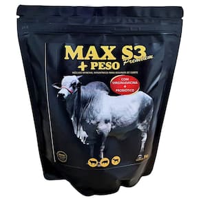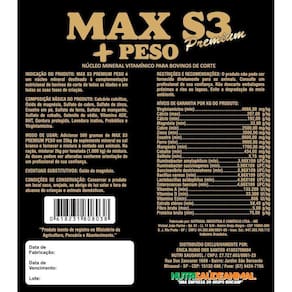 Núcleo mineral vitamínico para bovinos de corteComposição básica:Calcário calcítico, óxido de magnésio, sulfato de cobre, sulfato de zinco, enxofre em pó, sulfato de ferro, sulfato de manganês, sulfato de cobalto, selenito de sódio, vitamina ade, bht, gordura protegida, levedura inativa, probiótico e virginiamicinaIndicação de uso do produto:Max s3 premium peso é um núcleo mineral destinado à complementação nutricional de bovinos de corte de todas as idades e em todas as suas fases de criação.Modo de usar:Adicionar 250 gramas de max s3 premium peso em 25kg de suplemento mineral ou sal branco e fornecer a mistura à vontade aos animais. Na ração, misturar 1kg por tonelada 1.000 kg de mistura.As doses podem ser alteradas conforme orientação de um profissional de sua confiança.Níveis de garantia por quilograma do produto:DiscriminaçãoGarantiaUnidadeVirginiamicina min 4666,00Mg/kgCálcio max 207,00G/kgCálcio min 192,00G/kgMagnésio min 33,00G/kgCobre min 2500,00Mg/kgZinco min 3500,00Mg/kgEnxofre min 9000,00Mg/kgFerro min 9900,00Mg/kgManganês min 1700,00Mg/kgCobalto min 434,00Mg/kgSelênio min 3,15Mg/kgRuminobacter amylophilum min 3,99x109Ufc/kgRuminobacter succinogenes min 3,99x109Ufc/kgSuccinovibrio dextrinosolvens min 5,86x109Ufc/kgBacillus cereus min 4,66x109Ufc/kgLactobacillus acidophilus min 4,66x109Ufc/kgEnterococcus faecium min 4,66x109Ufc/kgVitamina a min 133.200Ui/kgVitamina d min 33.300Ui/kgVitamina e min 666Ui/kgExtrato etéreo min 58,40G/kgFibra bruta max 5,00G/kgProteína bruta min 75,00G/kgModo de conservação:Conservar o produto em local seco, arejado, ao abrigo de luz solar e fora do alcance de crianças e animais domésticos.Eventuais substitutivos:Óxido de magnésio.Restrições e recomendações:O produto não pode ser fornecido diretamente para os animais. Consulte um profissional de sua confiança. Não descarte embalagens próximos a rios ou lagoas. Evite a degradação do meio ambiente. Produto isento de registro no ministério da agricultura pecuária e abastecimento