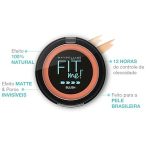 Blush em pó compacto para todos os tipos de pele. Maybelline Fit Me! Blush confere um aspecto corado e saudável ao rosto com efeito natural. Extremamente pigmentado, a textura do Blush Fit Me! Maybelline não deixa a pele oleosa ou ressecada. O pó ultrafino se espalha facilmente sobre as maçãs do rosto e a formulação, apesar de leve, oferece boa cobertura e longa duração.