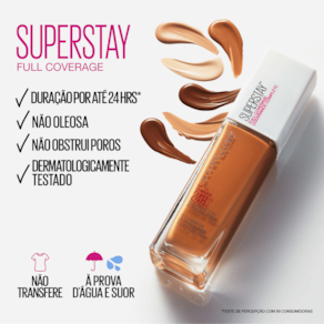 Base líquida. Maybelline Superstay Full Coverage proporciona duração de 24 horas e permanece intacta mesmo sobre condições de calor e umidade.
