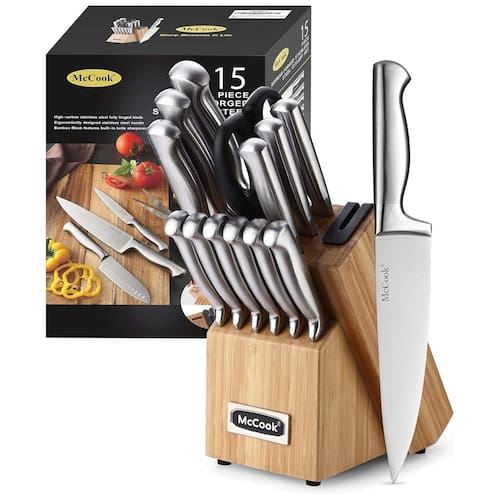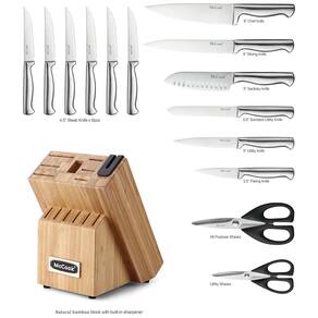 CONJUNTO DE FACAS DE COZINHA PREMIUM Resistente a manchas e ferrugem, este conjunto de talheres de aço inoxidável de alto carbono é de qualidade de conjunto de facas para restaurantes e escolas de culinária. Todas as nossas facas passaram por pelo menos 5 verificações antes de serem enviadas. CONJUNTO DE FACAS DE CLASSE MUNDIAL A exclusiva tecnologia de ponta cônica proporciona afiação ideal para um corte preciso e é fácil de reafiar. A alça de design ergonômico proporciona conforto e confiança no manuseio. FÁCIL DE ZENAR Todas as facas são zenadas com segurança no bloco de facas com afiador embutido para zenamento eficiente de espaço Marca: Não Informado