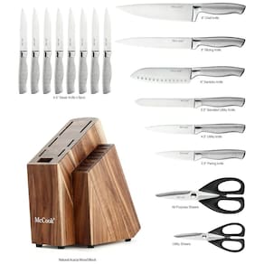 AÇO INOXIDÁVEL ALEMÃO FULL TANG Feito de uma peça de aço inoxidável, este conjunto de facas de cozinha martelado é de qualidade de conjunto de facas de restaurante e escola de culinária. Nossos conjuntos de facas passaram por pelo menos 5 verificações antes de serem enviados. CONJUNTO DE FACAS DE CLASSE MUNDIAL A exclusiva tecnologia de ponta cônica fornece afiação ideal para um corte preciso. A alça de design ergonômico proporciona conforto e confiança no manuseio. FÁCIL DE ZENAR Todas as facas forjadas são zenadas com segurança no bloco de facas de madeira de acácia para zenamento eficiente de espaço. Escolha McCook, confie na escolha de milhões de chefs. CUIDADO FÁCIL O conjunto de facas de cozinha com bloco é fácil e rápido de limpar. Para proteger a nitidez e o brilho das facas, NÃO lave as facas na máquina de lavar louça. Limpe e seque os imediatamente após a lavagem das mãos para tirar o máximo proveito deles Marca: Não Informado