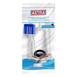 Mecanismo Completo Universal Superior AstraConjunto Completo Universal de mecanismos de descarga para caixa acoplada. Instalado dentro da caixa acoplada ao vaso sanitário para controlar o fluxo de entrada de água e eliminar os dejetos.Características:• Acionamento Superior• Compatível com todos os tipos de louça.• Maior desempenho e economia.• Acompanha boia, bolsa (anel) de vedação e dois parafusos para fixação na bacia.• Feito em plástico resistente.• Vedações em silicone, maior durabilidade e resistência.• Permite instalação em diversos níveis, sendo compatível com caixas acopladas de diversas alturas.• Tubo extravasor de regulagem telescópica para os modelos MU/E, MU/K e MU/F.• Indicado para caixa acoplada com saída de 2"" e entrada de 1/2"".• Regulagem de volume da descarga através do obturador.• Acompanha acionamento cromado.Código: 75031Marca: Astra