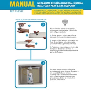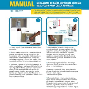 Mecanismo De Saída Universal Sistema Dual Flush Para Caixa AcopladaCaracterísticas:- Marca: Padova.- Referência:110597.- Indicado para todos os modelos de caixa acoplada.- Sistema Dual Flush.- Descarga com acionamento parcial e total.- Atende alta e baixa pressão.- Permite até 50% de economia de água.- Acompanha acionador em ABS cromado.- Altura ajustável do tubo extravasor (ladrão).Compatível com todas as marcas!Material disponível em nosso armazém!