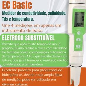 Medidor Condutivimetro Tds Salinidade Ppm + Soluções Padrão Compre com total tranquilidade pois priorizamos oferecer o melhor atendimento e apenas produtos de qualidade comprovada aos nossos clientes. ======================================================================= O EC Basic une em um instrumento de bolso 4 medições: condutividade, salinidade, TDS e temperatura. Possui eletrodo substituível, congelamento da leitura no visor e compensação automática de temperatura ATC . O EC Basic é excelente parceiro para os produtores de hidropônicos, devido a sua ampla faixa de medição. Outro ponto que vale a pena ser lembrado é que o instrumento pode ser ajustado em até 2 pontos: 12.88ms/cm e 1413uS/cm. Pode ser em diversos tipos de verduras, hortaliças e legumes dentro do ramo da hidroponia. Indicação de uso na hidroponia: batata-doce, batatinha, berinjela, brócolis, cebola, couve, couve de bruxelas, endívia, feijão, inhame, pepino comum , quiabo, repolho e tomate. O EC Basic utiliza a solução de condutividade 12.88ms/cm e 1413uS/cm para calibração. já inclusas . ======================================================================= INFORMAÇÕES TÉCNICAS Faixas de medição: Condutividade: 0 a 9999 S/cm 10.00 a 19.99 mS/cm 20.0 a 400.0 mS/cm Temperatura: 0 a 60.0C TDS: 0 a 9999 ppm 10.0 a 200.0 ppt Salinidade: 0 a 9999 ppm 10.0 a 200.0 ppt 0 a 25% Resolução: Condutividade: 1S/cm 0.1ms/cm 0.1ms/cm Temperatura: 0.1C TDS: 0.1 ppm 0.1 ppt Salinidade: 1ppm 0.1ppt 0.01% Exatidão: Condutividade: 2% F.S. Temperatura: 1.0C TDS: 2% F.S. Salinidade: 2% F.S. Ajuste de condutividade: 1413S/cm e 12.88ms/cm Compensação automática de temperatura ATC : 0 a 60C Grau de proteção: IP65 Desligamento automático: 5 minutos Temperatura de operação: 0 a 60C Umidade de operação: 10 a 90%UR sem condensação Alimentação: 4,5Vdc 3 pilhas LR44 Dimensões LxAxP : 38 x 183 x 38mm Peso: 80g ======================================================================= Funções adicionais: - Indicação de nível de carga das pilhas - Congelamento da leitura no visor HOLD ======================================================================= Clique no botão Comprar agora para garantir medidor Condutivimetro TDS Salinidade PPM + soluções padrão pelo melhor preço ======================================================================= Marca: Não Informado