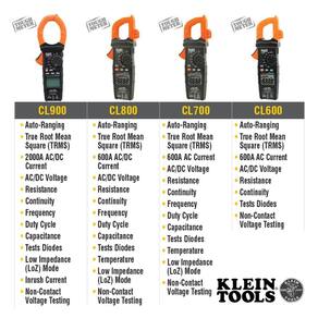 Klein Tools CL700 Braçadeira digital de alcance automático, TRMS 600 Amp, volts AC/DC, corrente, LoZ, continuidade, frequência, NCVT, temperatura, mais, 1000 V - Medidor de braçadeira resistente: mede corrente CA e NCVT via grampo; tensão AC/DC, resistência, continuidade, frequência/ciclo de trabalho, teste de diodo e capacitância através de cabos de teste; temperatura via termopar - Inclui uma bolsa de transporte, cabos de teste, termopar com adaptador e baterias - Atende aos requisitos para uso em ambientes eletromagnéticos básicos e controlados, como residenciais, escritórios e locais industriais leves - Temperatura operacional: 32 graus F a 104 graus F (0 graus C a 40 graus C) - Modo de baixa impedância: modo LoZ para identificar e eliminar tensões fantasmas ou dispersas - Visor retroiluminado: o LCD mostra leituras claras em condições de pouca luz para maior visibilidade - MEDIDAS PRECISAS: A tecnologia de alcance automático e True Root Mean Squared (TRMS) oferece medições precisas e precisas - CARACTERÍSTICAS CONVENIENTES: Suporte de grafite de teste na lateral do grampo e gancho magnético opcional (Cat. Nos. 69445 ou 69417) para operação sem usar as mãos - Durabilidade aprimorada: proteção de entrada IP40 e proteção contra quedas de 2 m para atender às demandas do local de trabalho - PACOTE COMPLETO: Inclui estojo de transporte, cabos de teste com tampas de segurança CAT III/CAT IV, termopar, instruções e 2 x pilhas AAA - Construído para suportar uma queda de 2 m - Indicador de bateria fraca e compartimento de bateria facilmente acessível