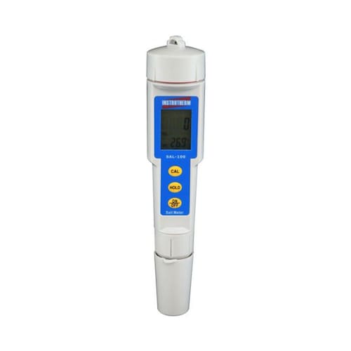 MEDIDOR DE SALINIDADE DIGITAL MOD.SAL-100 COM CERTIFICADO DE CALIBRAÇÂO RASTREÁVEL RBC DESCRIÇÃO: Medidor de salinidade digital mod.sal-100, incluso certificado de calibração rastreável rbc DESCRIÇÃO CERTIFICADO CALIBRAÇÃO: Certificado de Calibração P/ Medidor de Salinidade SAL-100 Calibração rastreável Procedência: Laboratório de Calibração Instrutherm ESPECIFICAÇÕES TÉCNICAS: Display: LCD duplo com indicação de temperatura e medição de salinidade Escala salinidade: 0 a 1000 mg/L Precisão: ±2 mg/L +1%F.S. Resolução: 1 mg/L Data hold: congela leitura no display Compensação de temperatura automática: 0 a 50°C (32 a 122°F) Sensor substituível Desligamento automático Escala de temperatura: 0 a 50°C (32 a 122°F) Precisão: ±0,5°C (±1°F) Umidade de operação: <80%U.R. Dimensões: 188 x 38 mm Peso: Aprox. 82g ACESSÓRIOS FORNECIDOS: Estojo 4 baterias tipo botão (LR44) Manual de instruções Certificado de calibração rastreável rbc