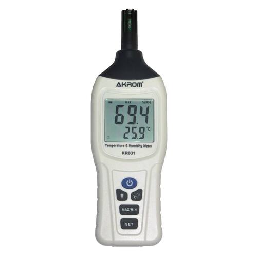 1. Descrição Geral O medidor de temperatura e umidade relativa do ar KR831 da Akrom possui um design inovador com amplo display LCD de dupla indicação e iluminação backlight , o que permite a sua utilização em locais escuros ou com baixo nível de iluminação. Ele indica também a temperatura do ponto de orvalho Dew Point , abaixo da qual a umidade presente no ar sofre condensação. Registra os valores de temperatura e umidade máximos e mínimos, permite congelar a indicação HOLD e corrigir eventuais desvios na indicação da umidade relativa do ar ajuste via teclas . 2. Especificações Técnicas Temperatura: Faixa de medição: -20 a 70°C Resolução: 0.1°C Exatidão: ± 1°C Umidade relativa do ar: Faixa de medição: 0 a 100%UR Resolução: 0.1%UR Exatidão: ± 3%UR 20 a 80%UR ± 4%UR restante da faixa Temperatura de operação: -20 a 70°C Umidade de operação: 0 a 100%UR sem condensação Alimentação: 9V 1 bateria 6F22 Dimensões L x A x P : 62 x 158 x 32 mm Peso: 150 g 3. Recursos Adicionais - Indicação do ponto de orvalho Dew Point - Calibração ajuste de umidade - Amplo visor LCD com dupla indicação - Registro de máximas e mínimas - Congelamento da indicação HOLD - Seleção °C / °F - Visor iluminado backlight - Indicação do nível de carga da bateria - Desligamento automático selecionável 4. Acessórios Inclusos - Bolsa para transporte - Bateria de 9V - Manual de instruções em português Marca: Akrom : 2 anos Marca: Não Informado Ean: 7900661644311
