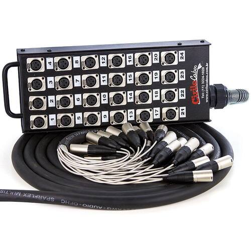 Medusa 24 Vias Com Conectores Xlr Neutrik - 20 Mt Medusa montada pela Cirilo Cabos com conectores XLR da marca Neutrik, que fabrica conectores que são usados em estúdios de gravação de áudio e vídeo e sistemas de som. Este produto é ideal para transmissão de som profissional, sem prejuízos na qualidade ou interferência de ruídos externos. A banheira da Cirilo Cabos feita em metal com pintura epóxi preto, tem uma alça para facilitar o transporte. O cabo espaguetado e numerado via-a-via orienta na usabilidade do produto. Na extremidade do multicabo, tem uma mola de proteção. Esta caixa de conectores é resistente e durável, suporta o ritmo de trabalho de quem produz engenharia sonora. Este produto vai te auxiliar na organização de palco e distribuição dos canais para instrumentos e músicos. A medusa de som com seis vias é um ponto de ancoragem de palco que vai reduzir o fluxo de cabos levados até a técnica. Com ela você otimiza seu projeto de som, conectando instrumentos com saída P10, cabos de microfone e outros. ESPECIFICAÇÕES Canais: 24 Vias Conector painel: XLR F Neutrik Conector cabo: XLR M Neutrik Diâmetro do cabo: 11,60mm Marcas de cabos disponíveis: TiaFlex, SparFlex ou Datalink Condutor: Corda de cobre estanhado OFHC 24 AWG; dreno de cobre estanhado OFHC + fita de poliéster Isolação: Termoplástico resistente a altas temperaturas e baixa retração durante a solda Garantia de 3 meses. Precisa de uma configuração especifica Aqui na Cirilo Cabos nós temos diversas configurações, de 6 vias até 48 vias, podendo ser montadas de acordo com a sua necessidade. Dentro dessa variação de 6 a 48 vias o valor será o mesmo apresentado no site. Qualquer outra configuração acima disso, por favor, consulte nossos vendedores de Segunda á Sexta das 09:00 às 18:00..