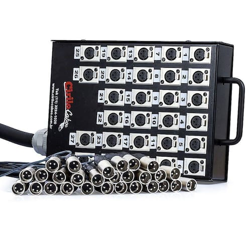 Medusa 36 Vias Montada Conectores Cirilo Cabos - 5 Metros A Medusa de 36 vias montada com conectores da Cirilo Cabos, também conhecida como caixa de conectores ou banheira, oferece organização na distribuição dos seus canais. Ideal para a transmissão de áudio, oferecendo uma melhor qualidade entre os instrumentos e a mesa de som. Conta com alça para transporte e multicabos com molas de proteção.