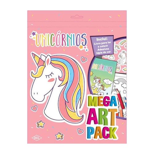 Este kit inclui livro de colorir, cartela de adesivos e lápis de cor em uma linda embalagem metalizada com fantásticos unicórnios.