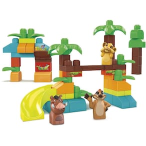 Hakuna Matata. O mundo de O Rei Leão ganha vida com este grande e colorido conjunto de blocos de montar que também inclui peças especiais com tema tropical. Com um escorregador na selva e peças que giram para revelar larvas deliciosas, as versões de Block Buddies do Simba, Timão e Pumba podem se banquetear enquanto seu filho brinca. Quando a brincadeira acabar, os blocos podem ser guardados no recipiente abre-fecha e assim limpar tudo facilmente, sem ter que se preocupar.