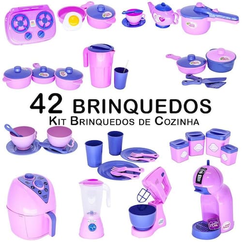o kit vem com fogão cooktop air fryer batedeira liquidificador cafeteira com cápsula panela de pressão xícara com pires e colher açucareiro jogo de panela com talheres pratos copos talheres jarra potinhos de mantimentos 42pç
