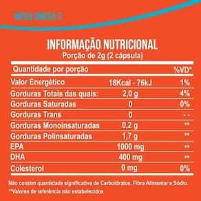 Validade longa: mínimo de 1 ano e 6 meses Produto selado com lacre de segurança Estudos observaram que os esquimós que viviam na groenlândia apresentavam índice muito baixo de doenças que são comuns em países ocidentais, doenças do coração, diabetes, asma entre outras, e perceberam que os esquimós consumiam uma grande quantidade de peixes, esse consumo foi associado a uma quantidade de ácidos graxos poliinsaturados como o ômega 3 . Os lipídios, principalmente ácidos graxos, são encontrados em diversas formas de vida e são muito importantes para nossas membranas celulares, e para várias funções do organismo. O ômega 3 é uma família de diferentes tipos de ácidos graxos que são considerados essenciais, ou seja, nosso corpo não é capaz de produzir sozinho. A família do ômega 3 contempla 3 ácidos graxos. Oácido eicosapentaenóico tem uma ação anti inflamatória, importante para saúde do coração e circulação, diminuindo a chance de coágulos e diminuindo a chance de trombose, avc e outras doenças de caráter inflamatório. O ácido docosaexaenoico, é importante para a saúde do nosso cérebro, e para o desenvolvimento fetal, da retina dos olhos, ajuda na memória, cognição, raciocínio, imaginação, e vários fatores relacionados à saúde da mente.