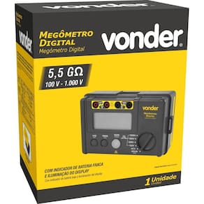1 Megômetro digital. Acompanha: 1 bolsa de nylon, 2 cabos com garras tipo jacaré e 2 pontas de prova.