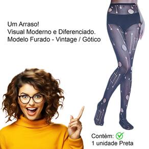 Meia Calça Arrastão Furada Rasgada com Buraco - Modelo Retrô Gótico Punk Rock Halloween. Design moderno, vazado com buracos grandes e pequenos imitando desfiado. Ideal para compor um visual estiloso e diferenciado. Perfeita como acessório de moda com seus vestidos, saias, shorts, salto alto, tênis, botas, coturnos, jeans, etc., proporcionando versatilidade na composição de seus looks preferidos. Confortáveis, deixam suas pernas com uma aparência magra e diferente. Arrase nas festas temáticas, baladas ou festivais. Cor: Preta. Tamanho único: Vesto do manequim 40 ao 46. Possui elasticidade, se moldando ao corpo. Composição: 92% nylon, 8% elastano. Cuidados: Lavar a mão e secar a sombra. Armazenar em embalagem plástica para proteção. A durabilidade do produto depende de seus cuidados. Atenção: Recebemos novas remessas semanalmente e algum detalhe pode variar conforme o lote recebido, porém o produto é o mesmo e mantém a mesma qualidade e característica. Contém: 1 meia calça furada na cor preta. Fotos ilustrativas e reais do produto.
