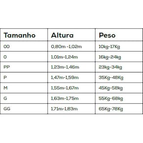 00: Altura - 0,80 m a 1,02 m / Peso - 10 kg a 18 kg