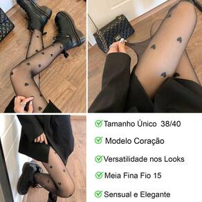 Meia Calça Fio 15 Fina Desenhada Modelo Coração Tamanho Único 38/40. Meia fina Fio 15 em tamanho único que atende até a numeração 40, na cor preta com estampas de coração, ponta do pé com ponteira e barra superior reforçada. Deliciosamente chique e com um toque extravagante de Sofisticação. Os corações são médios, medindo aproximadamente 2 cm, podendo o tamanho variar conforme remessa recebida. Composição: 80% nylon, 20% spandex. Produto delicado, deve ser lavado à mão. Comprimento aproximado da meia ao retirar da embalagem: 107 cm. Cavalo 24 cm. Cor da meia: Preta. Indispensável no guarda-roupa da mulher moderna, pois vai bem em qualquer ocasião, do clássico ao mais ousado. Combina com qualquer tipo de calçado, o que proporciona versatilidade na peça. Atenção: Produto de alta rotatividade. Recebemos novas remessas semanalmente e algum detalhe pode variar conforme o lote recebido, porém o produto é o mesmo e mantém as mesmas características e qualidade. Composição: 80% nylon, 20% elastano. Contém: 1 meia fina preta com estampa de coração tamanho único 38/40. Fotos ilustrativas e reais do produto.