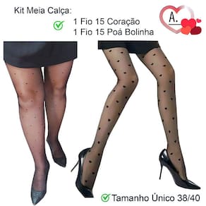 Meia Calça Poá Bolinhas + Meia Calça Coração Fio 15 - Tamanho Único 38/40. Kit com 2 meias calça desenhadas. Tamanho: 38/40. Cor: Preto. Modelo: Desenhado Bolinhas e Coração. Poá / Bolinhas: Estilo Retrô, com bolinhas médias pretas, ponta do pé com ponteira e barra superior reforçada. As bolinhas são médias, medindo aproximadamente 0,40 cm. Composição: 80% nylon, 20% spandex. Produto delicado, deve ser lavado à mão. Comprimento aproximado da meia ao retirar da embalagem 0,96 cm. Cavalo 22 cm. Coração: Meia fina Fio 15 em tamanho único que atende até a numeração 40, na cor preta com estampas de coração, ponta do pé com ponteira e barra superior reforçada. Deliciosamente chique e com um toque extravagante de sofisticação, os corações são médios, medindo aproximadamente 2 cm, podendo o tamanho variar conforme a remessa recebida. Composição: 80% nylon, 20% spandex. Produto delicado, deve ser lavado à mão. Comprimento aproximado da meia ao retirar da embalagem: 107 cm. Cavalo 24 cm. Lindas, modernas e indispensável no guarda-roupa, pois vai bem em qualquer ocasião, do clássico ao mais ousado, combinando com qualquer tipo de calçado. Produto delicado, deve ser lavado à mão. Atenção: Produto de alta rotatividade. Recebemos novas remessas semanalmente e algum detalhe pode variar conforme o lote recebido, porém o produto é o mesmo e mantém as mesmas características e qualidade. Contém: 1 meia calça Poá (Bolinhas) + 1 meia calça Coração, ambas na cor preta, em tamanho único 38/40. Fotos ilustrativas e reais do produto.