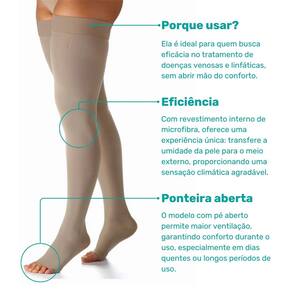 Com compressão graduada de 20-30 mmHg, é indicada para o alívio de sintomas como varizes, inchaço e cansaço nas pernas, além de auxiliar no tratamento de condições venosas mais complexas.