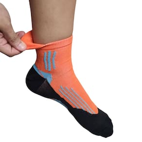 A meia possui cano curto e calcanhar, com ajuste anatômico e faixa de compressão para conferir estabilidade.