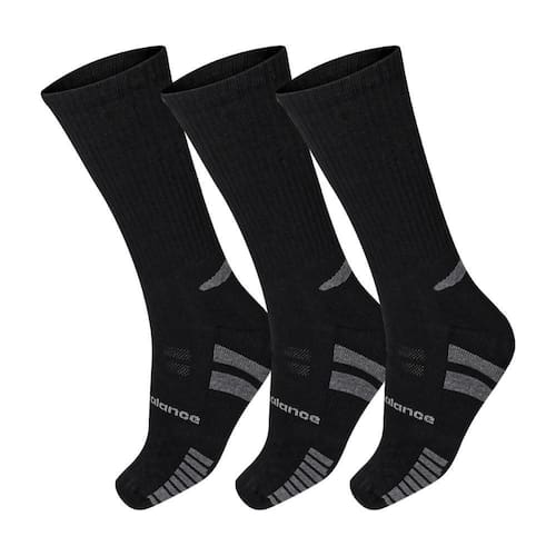 - Detalhamento: O pacote inclui 3 pares de meias com cano alto (17cm) na cor preta, oferece suave compressão na região do médio pé. As meias possuem o logo New Balance na região do cano e vestem do tamanho 39 ao 43;