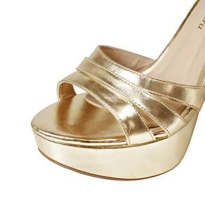 Linha de Meia Pata Salto Alto Fino Luiza Sobreira, produzida em material sintético na cor Dourado, com palmilha e forro em P.U., solado em TR.