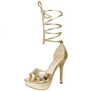Linha de Meia Pata Salto Alto Fino Luiza Sobreira, produzida em material sintético na cor Dourado, com palmilha e forro em P.U., solado em TR.