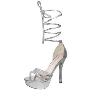 Linha de Meia Pata Salto Alto Fino Luiza Sobreira, produzida em material sintético na cor Prata com detalhes em strass, com palmilha e forro em P.U., solado em TR.