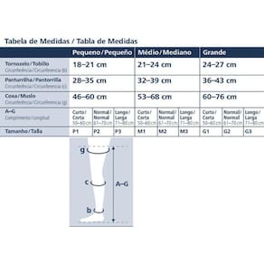 - G: Tornozelo 24 a 27 cm, panturrilha 36 a 43 cm e coxa 60 a 76 cm.
