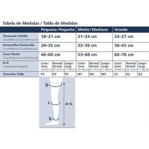 - G: Tornozelo 24 a 27 cm, panturrilha 36 a 43 cm e coxa 60 a 76 cm.