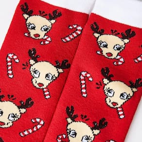 - Meias vermelhas apresentam imagens de renas e bengalas doces.